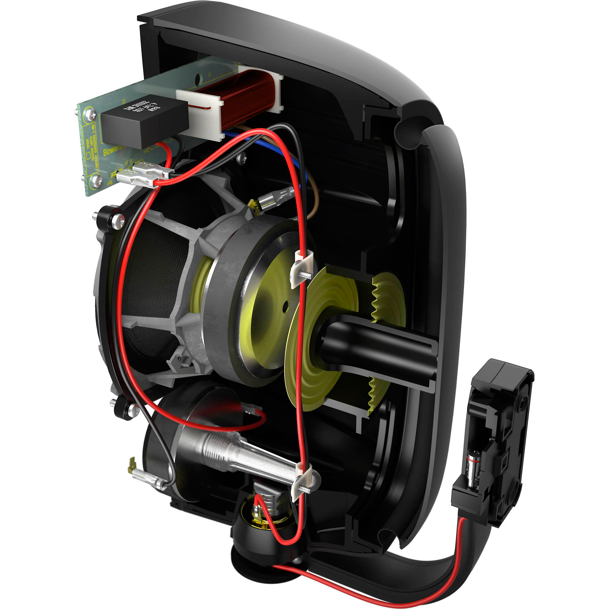 Акустическая система B&W AM-1 представляет собой всепогодную модель высокого класса, которая обладает продуманной конструкцией и хорошим качеством звука. Колонка имеет двухполосную конструкцию и оснащена высокочастотным излучателем с 25-мм алюминиевым куполом, а также басовиком с 5-дюймовым диффузором из стекловолокна. Динамики в колонке расположены инвертировано (пищалка под твитером), чтобы обеспечить равномерную диаграмму направленности и синхронизацию звучания во всем диапазоне частот при размещении B&W AM-1 высоко на стене. ВЧ-динамик в колонке нагружен на суживающуюся трубку. Еще одной особенностью данной акустической системы является использование для нагрузки басовика не традиционного фазоинвертора, а пассивного НЧ-излучателя, расположенного на задней панели. Это позволило значительно улучшить качество и глубину басов колонки, особенно с учетом ее размещения в непосредственной близости от стен. Еще одним преимуществом такого решения является то, что корпус АС остался фактически закрытым, поэтому данную колонку можно использовать и вне помещений.