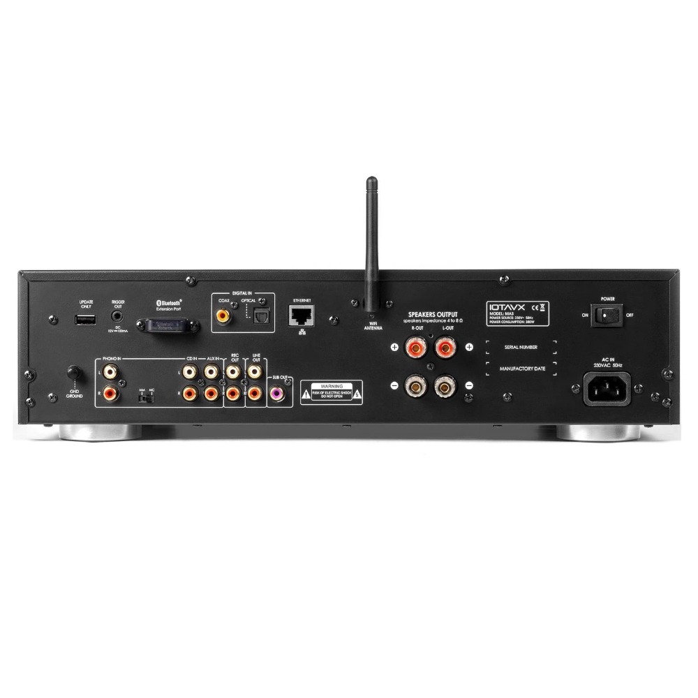 IOTAVX MA3 – интегральный стереоусилитель со встроенными сетевым проигрывателем, ЦАП, Bluetooth и Wi-Fi - с выходной мощностью 2 x 50 Вт (8 Ом). Обеспечивает потоковое воспроизведение аудио, поддерживает функции мультирум, Airplay, DLNA, интернет-радио (vTuner), Spotify, TIDAL, Napster, Qobuz, Deezer, работает с приложением Linkplay и устройствами на базе IOS и Android. Подключение: беспроводное по Wi-Fi (2,4 G и 5 G) и Bluetooth (5.0 кодеки aptX, аptX HD и AAC, антенна в комплекте) и проводное к локальной сети (LAN). IOTAVX MA3 был удостоен специальной награды: премии TOP HIGH END в области премиального аудио-видео оборудования за самое "Оптимальное Соотношение Цены, Качества и Набора Потребительских Функций" на выставке HI-FI & HIGH END SHOW, прошедшей в Москве 20-22 октября 2023 года.