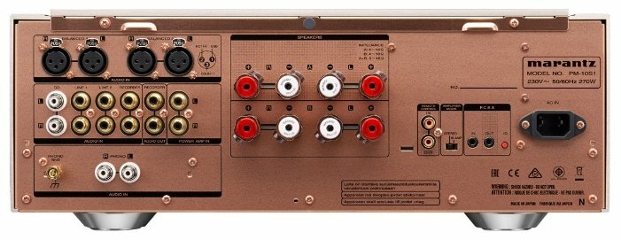 Модель оснащена двумя балансными (XLR) и четырьмя несимметричными входами (RCA). При использовании RCA обычный сигнал тоже преобразуется в балансный. Имеется вход MM/MC-фонокорректора и разъемы для прямого доступа к оконечному каскаду. Есть выход для записи. Для подключения спикеров используются 8 винтовых клемм Marantz SPKT-100+ из очищенной меди. Имеются разъемы фирменной шины D-Bus и сокеты шины F.C.B.S., позволяющей построить управляемую многоканальную систему с несколькими усилителями Marantz PM-10. Для перехода в би-ампинговый режим на тыльной панели присутствует специальный переключатель.