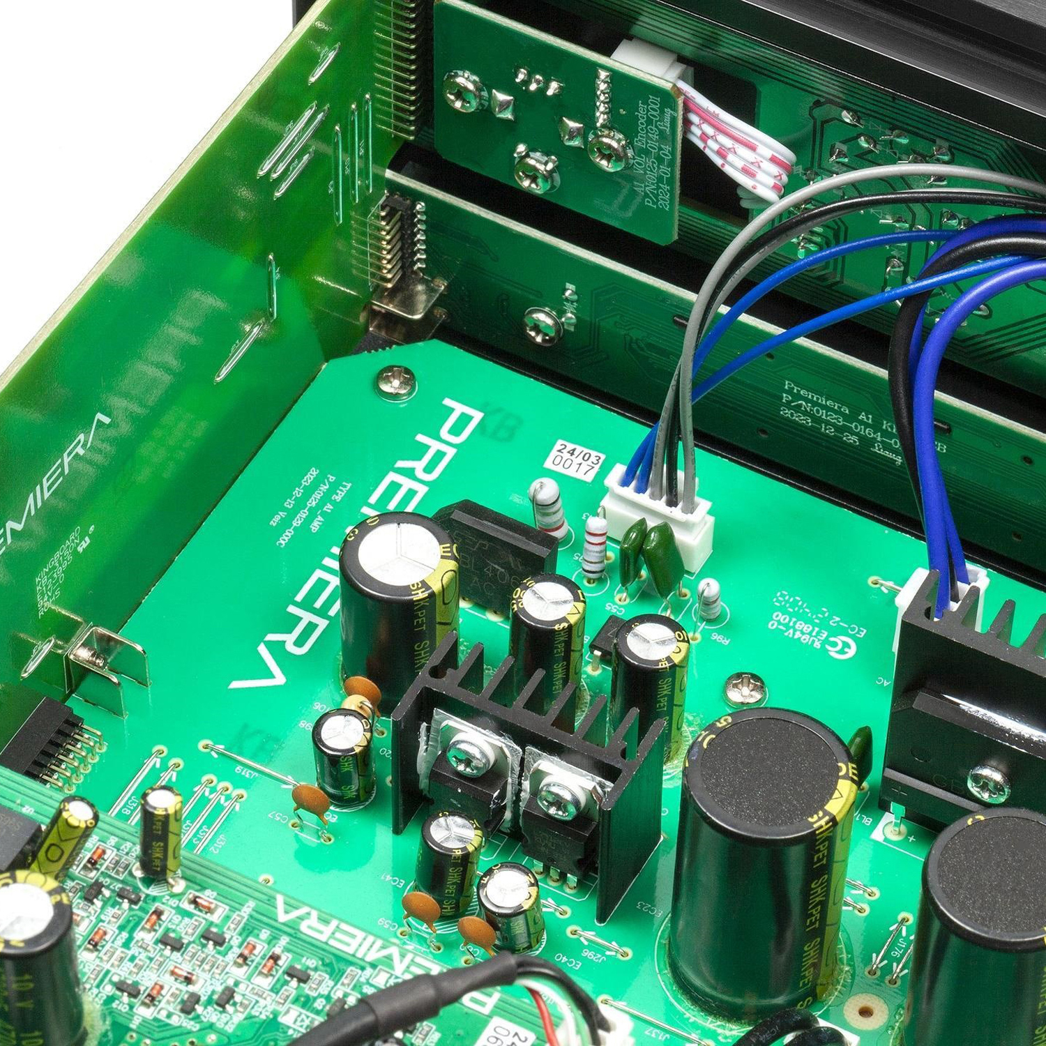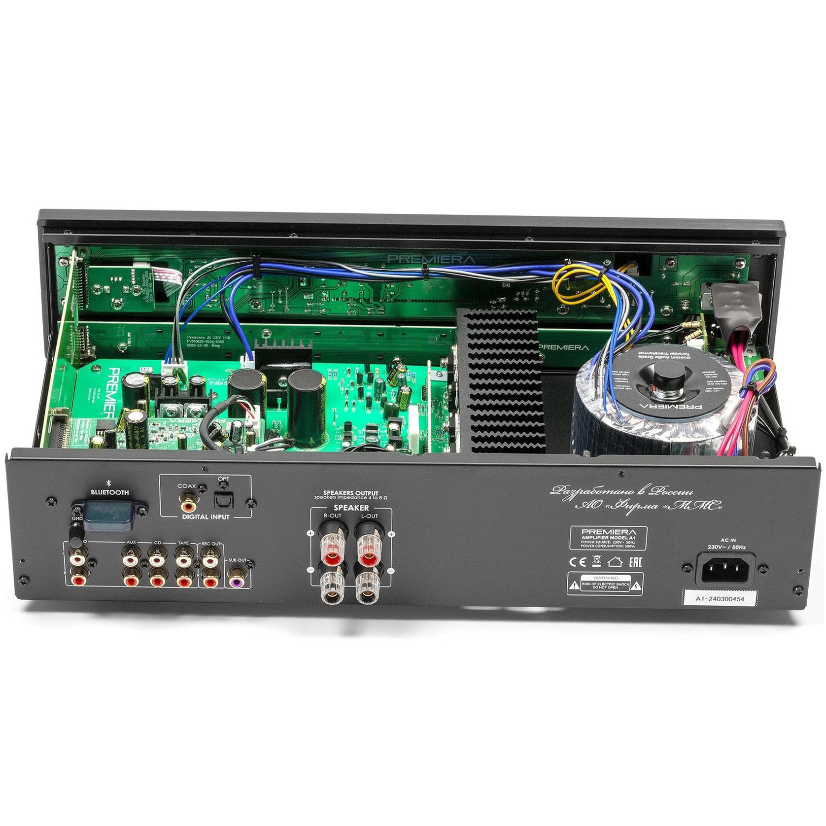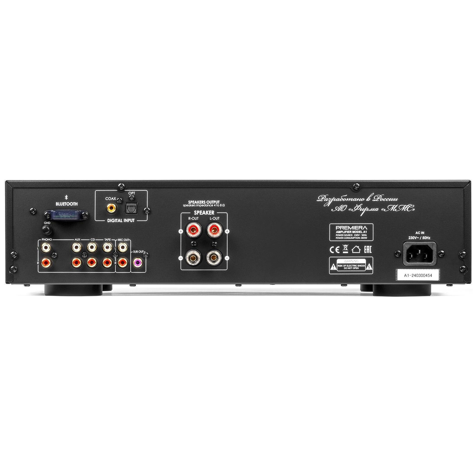 Premiera A1 — разработанный в России высококачественный интегральный Hi-Fi стереоусилитель класса AB со встроенным ММ-фонокорректором, ЦАП и Bluetooth 5.0, входами S/PDIF и Toslink, USB-A, тремя аналоговыми входами стерео линейного уровня, с номинальной выходной мощностью 51 Вт на канал (8 Ом) предназначен для использования в профессиональных и домашних стереосистемах. Удобное управление и простоту настроек обеспечивает универсальный регулятор на лицевой панели усилителя и пульт дистанционного управления. Благодаря широким возможностям подключения, устройство можно использовать почти с любыми источниками для воспроизведения – как аналоговыми, так и цифровыми.