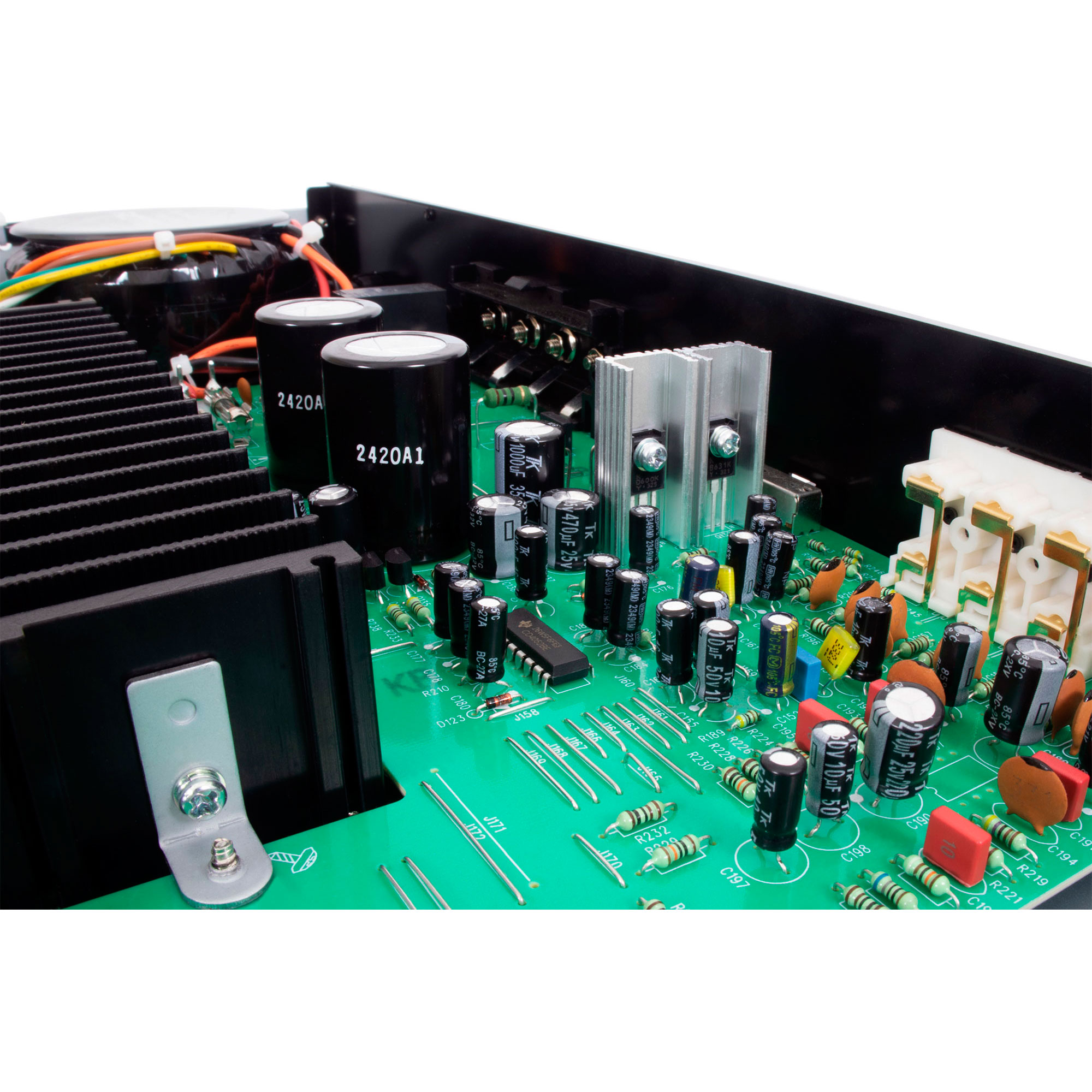 Вся схема собрана на одной плате, что позволило оптимизировать размещение компонентов и уменьшить шумы. Оконечные усилители имеют симметричную топологию каналов для улучшения стереокартины. Несмотря на небольшую высоту корпуса, Rotel A8 работает в классе A/B, его выходные транзисторы расположены на радиаторе с увеличенной продольной величиной ребер для эффективного отведения тепла. В блоке питания аппарата установлен заказной тороидальный трансформатор значительной мощности. Модель развивает до 30 Вт на канал при работе на 8-омную акустику и легко справится с озвучиванием комнат средних размеров.