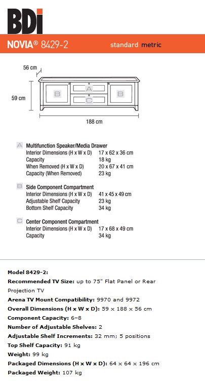 Стойка BDI Novia 8429 идеально подойдет для установки телевизоров с большой диагональю и большого количества аппаратуры. Длина тумбочки достигает 188 см, максимальная нагрузка на верхнюю столешницу - 91 кг.